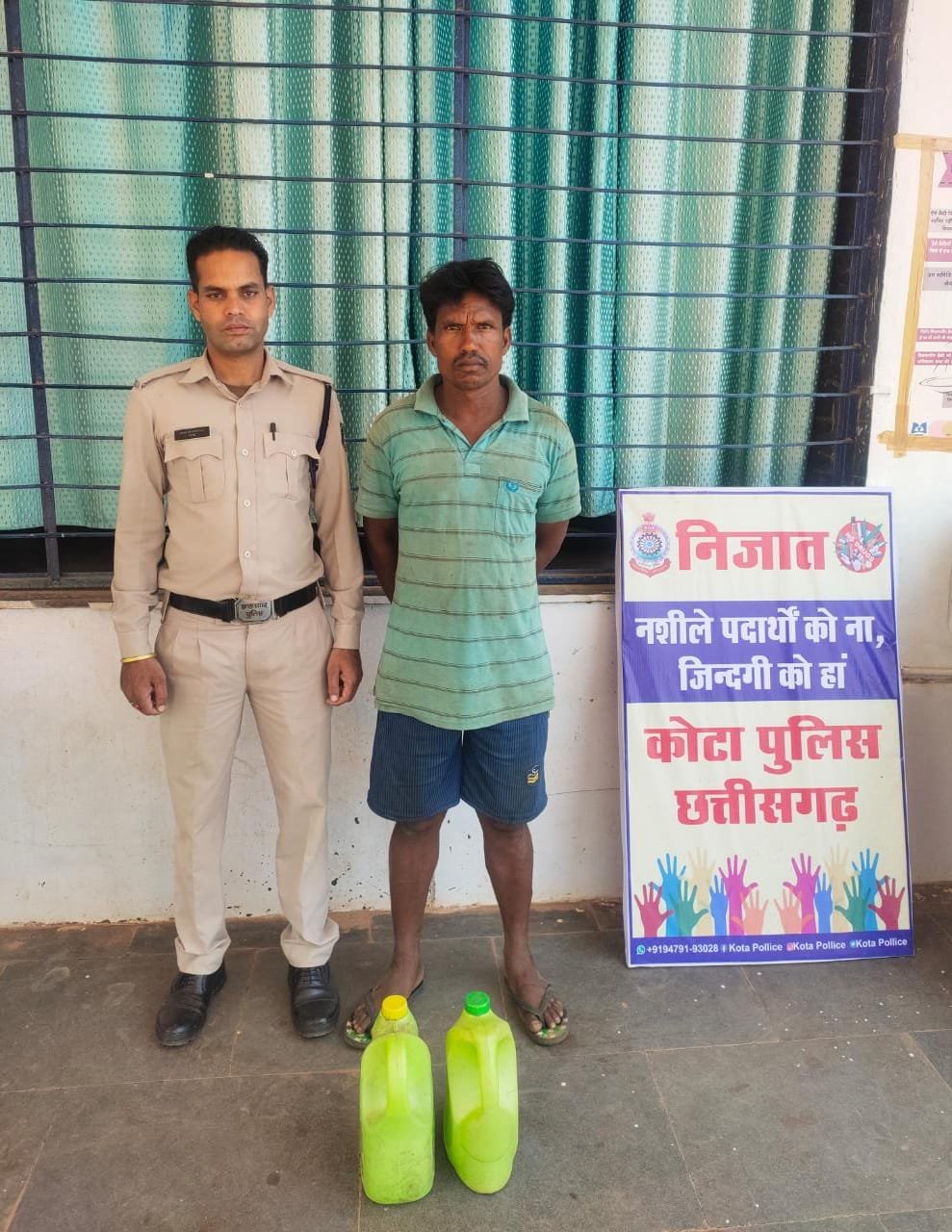 बिलासपुर। पुलिस अधीक्षक संतोष सिंह के द्वारा बिलासपुर जिले में निजात अभियान चलाया जा रहा है। निजात अभियान के अंतर्गत नशामुक्ति हेतु अतिरिक्त पुलिस अधीक्षक (ग्रामीण) राहुल देव शर्मा एवं अनुविभागीय पुलिस अधिकारी सिद्धार्थ बघेल के मार्गदर्शन में थाना कोटा में अवैध शराब बिक्री करने वालों के विरुद्ध लगातार कार्यवाही की जा रही है इसी परिप्रेक्ष्य में दिनांक 08.05.2023 को थाना प्रभारी कोटा उत्तम साहू को सूचना मिला की एक व्यक्ति नवागांव तरफ से अवैध रूप से कच्ची महुआ शराब रखकर बिक्री करने हेतु कोटा की ओर पैदल लेकर जा रहा है सूचना पर तत्काल थाना प्रभारी द्वारा पुलिस टीम नवागांव की ओर रवाना किये कि अटल आवास कुवारीमुडा के पास पहुंचे ही थे कि एक व्यक्ति हाथ में थैला लिए पैदल नवागांव तरफ से आ रहा था जिसे नाम पूछने पर अपना नाम जगन सिह संवरा पिता आत्माराम संवरा उम्र 40 साल साकिन संवरापारा लालपुर का रहने वाला बताया तथा हाथ में रखें सफेद रंग के प्लास्टिक थैला को चेक करने पर थैला के अंदर दो हरे रंग के 5-5 लीटर वाली जरीकेन मे कुल 10 लीटर कच्ची महुआ शराब मिला।