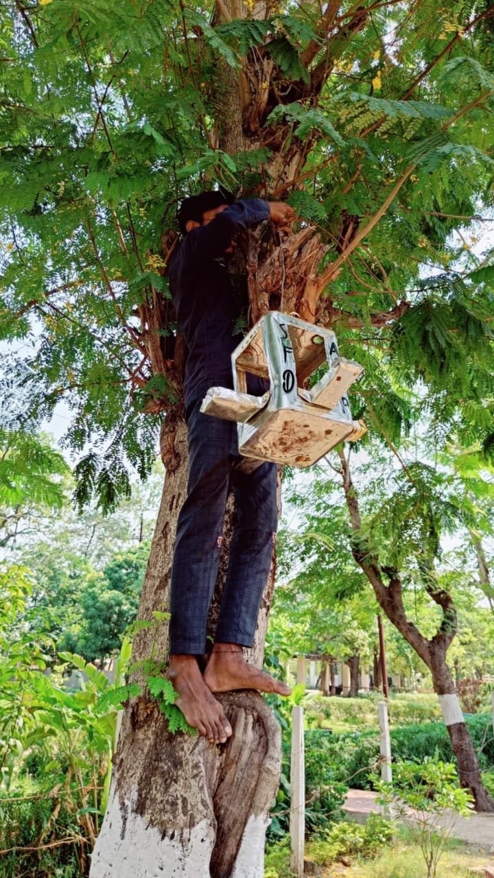 कोरबा: ABVP द्वारा गर्मी में बेजुबान पक्षियों को पानी पिलाने के लिए बनाए गया टीन के टीपे को कटकर के सकोरा