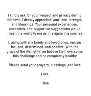कई ऐसी अफवाहें आई थीं जिसपर मैं बात करना चाहती हूं. मैं सभी हिनाहोलिक्स और उन सभी लोगों के साथ कुछ एक जरूरी बात करना चाहती हूं जो मुझे प्यार करते हैं और मेरी परवाह करते हैं. मुझे स्टेज थ्री ब्रेस्ट कैंसर का पता चला है.