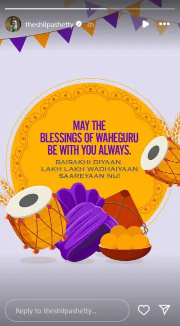 अभिनेत्री शिल्पा शेट्टी ने भी इस मौके पर बधाई संदेश अपनी इंस्टाग्राम स्टोरी पर साझा किया है। उन्होंने लिखा है, ‘वाहेगुरू की दुआएं हमेशा आपके साथ रहें। आप सभी को बैसाखी की लख लख बधाईयां’। अभिनेत्री रकुल प्रीत सिंह ने भी पोस्ट साझा किया है।