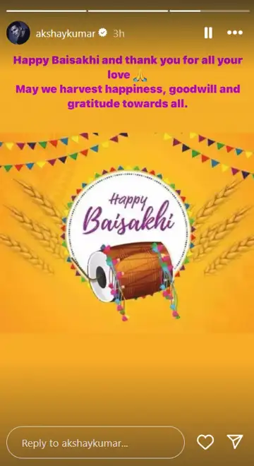 इसके अलावा बॉलीवुड के खिलाड़ी अक्षय कुमार ने भी पोस्ट साझा कर बधाई दी हैं। उन्होंने लिखा है, ‘आप सभी को बैसाखी की बधाई। आप सभी से मिले प्यार के लिए शुक्रिया। हम खुशियां फैलाएं और अच्छाई बांटें।’ अक्षय कुमार इस वक्त फिल्म ‘बड़े मियां छोटे मियां’ को लेकर चर्चा बटोर रहे हैं।