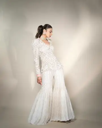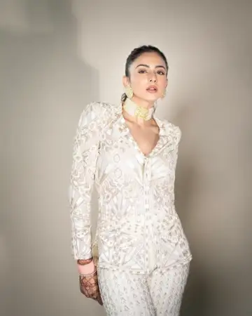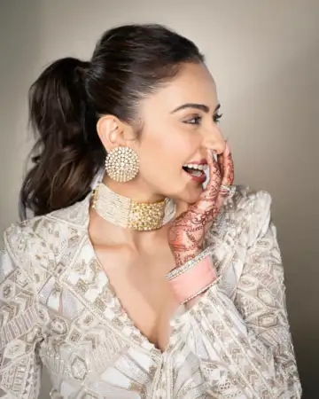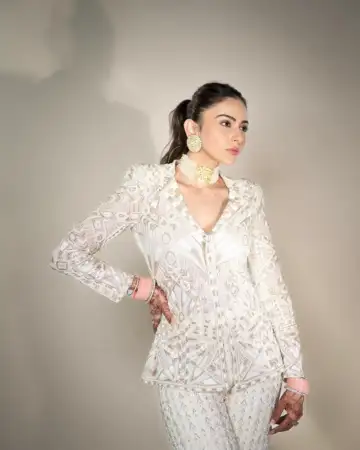 लुक की बात करें तो रकुल व्हाइट शरारा सूट में बला की खूबसूरत लग रही हैं। रकुल ने मिनिमल मेकअप,लिपस्टिक,बल्श से अपने लुक को पूरा किया था। हाथों में पिंक चूड़ा और पिया के नाम मेहंदी उनके लुक को चार-चांद लगा रहे हैं।