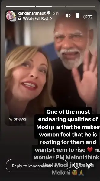 कंगना रनौत ने इटली की प्रधानमंत्री जॉर्जिया मेलोनी द्वारा शेयर किए गए वीडियो को रिशेयर करते हुए लिखा, ‘मोदी जी की सबसे खास खूबियों में से एक यह है कि वह महिलाओं को यह एहसास दिलाते हैं कि वह उन्हें आगे बढ़ते देखना चाहते हैं और वह उनके साथ हैं. इसमें कोई शक नहीं कि मेलोनी मोदी जी को एक टीम की तरह मानती हैं.’
